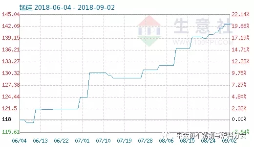 9月2日錳硅商品指數為142.59,與昨日持平,較周期內最高點155.26點(2017-12-17)下降了8.16%,較2015年12月30日最低點61.46點上漲了132.00%。(注:周期指2014-09-01至今)