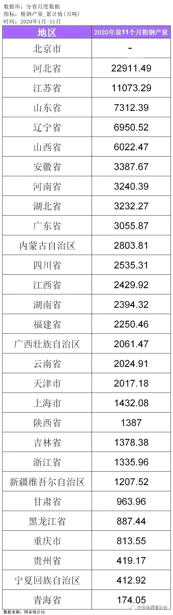 從地區來看,2020年前11個月,我國粗鋼產量排名前5位的省份分別為:河北省(22911.49萬噸)、江蘇省(11073.29萬噸)、山東省(7312.39萬噸)、遼寧省(6950.52萬噸)、山西省(6022.47萬噸)。具體情況見下表: