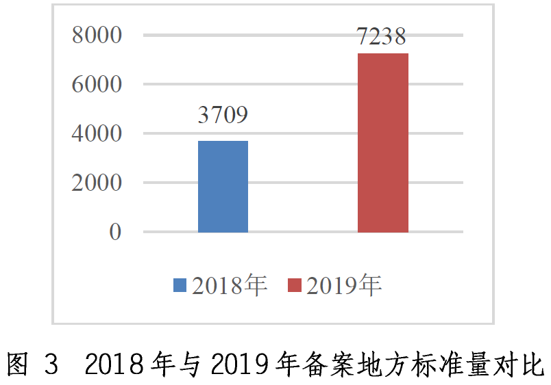 2019年備案地方標準7238項。與2018年相比,2019年度備案量增加3529項,對比情況見圖3。截至2019年12月底,備案地方標準共42881項。