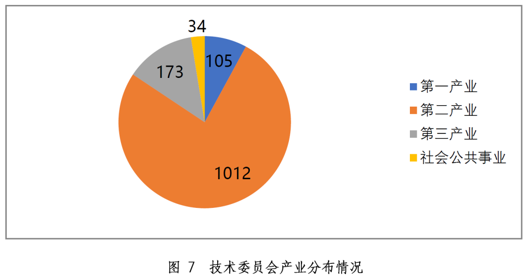 截至2019年底,全國專業標準化技術委員會共1324個,包括552個TC,760個SC和12個SWG。按產業劃分,第一產業技術委員會共105個,占比7.93%;第二產業技術委員會共1012個,占比76.43%;第三產業技術委員會173個,占比13.07%;社會公共事業技術委員會34個,占比2.57%,技術委員會產業分布情況見圖7。