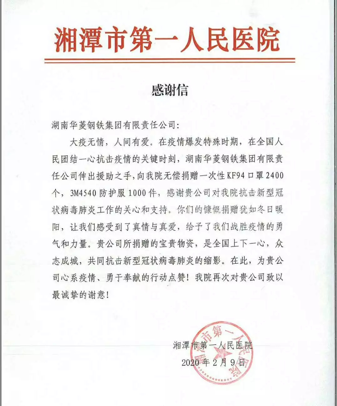 此前,了解到醫(yī)療機(jī)構(gòu)面臨醫(yī)用物資匱乏,尤其是醫(yī)用口罩、防護(hù)服急缺的情況后,華菱漣鋼通過多方渠道緊急采購了12.7萬只防護(hù)口罩、100套防護(hù)服,先后分別捐贈給紅十字會、婁底市中心醫(yī)院、婁底市第一人民醫(yī)院等醫(yī)療機(jī)構(gòu)。 華菱漣鋼職工也自發(fā)為醫(yī)療機(jī)構(gòu)捐錢捐物,提供力所能及的幫助。該公司210轉(zhuǎn)爐廠連鑄車間黨支部組織黨員向婁底市第一人民醫(yī)院捐贈一萬余元;一煉軋廠行車車間共產(chǎn)黨員李從軍、人力資源服務(wù)公司職工曾力多方尋找資源,先后購買了320套防護(hù)服分別捐贈給婁底市中心醫(yī)院和婁底市第一人民醫(yī)院。 當(dāng)前,全國疫情防控工作已進(jìn)入關(guān)鍵時(shí)期,形勢依然嚴(yán)峻。“這個時(shí)候,我們應(yīng)該擔(dān)當(dāng)使命,履行好自己的責(zé)任!”在簡單的捐贈儀式上,漣鋼集團(tuán)副總經(jīng)理、工會主席汪慶祝如是說。 華菱湘鋼 2月14日,華菱湘鋼向湘潭市防疫辦公室捐贈現(xiàn)金1000萬元,全力支持湘潭市疫情防控工作。